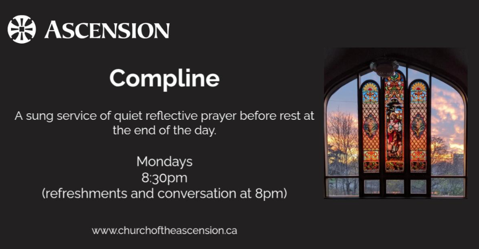 Join us for a sung service of quiet reflective prayer before rest at the end of the day, on Mondays at 8:30pm. Come earlier for refreshments and conversation, starting at 8:00pm.