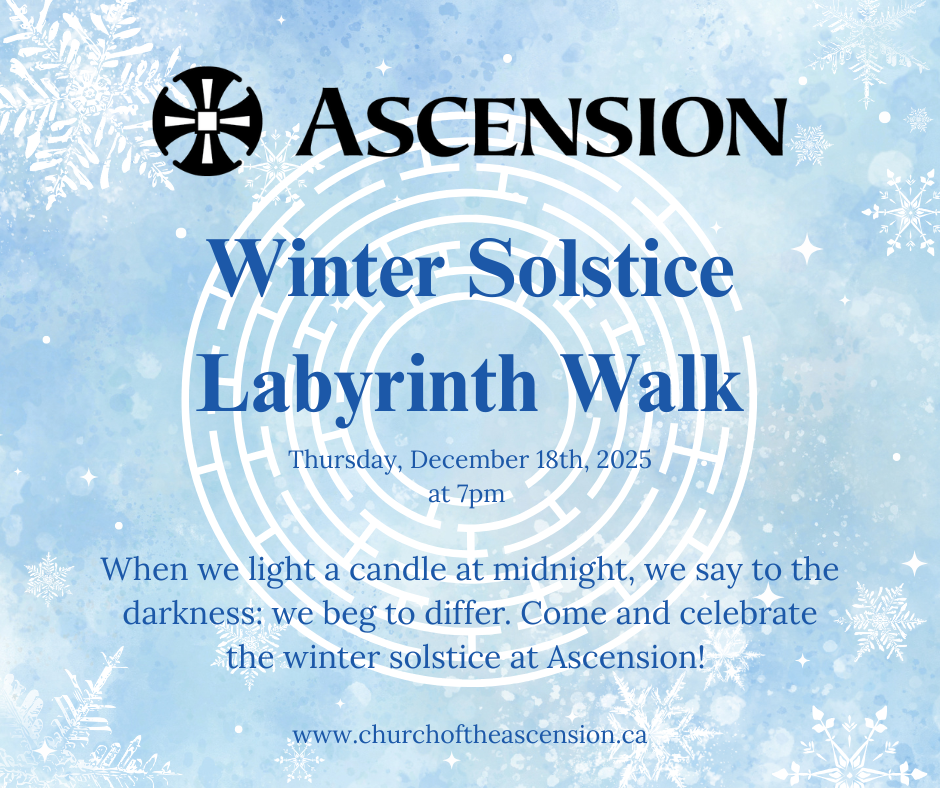 Come and celebrate the Winter Solstice with prayer and reflection and walk Ascension’s temporary indoor labyrinth.